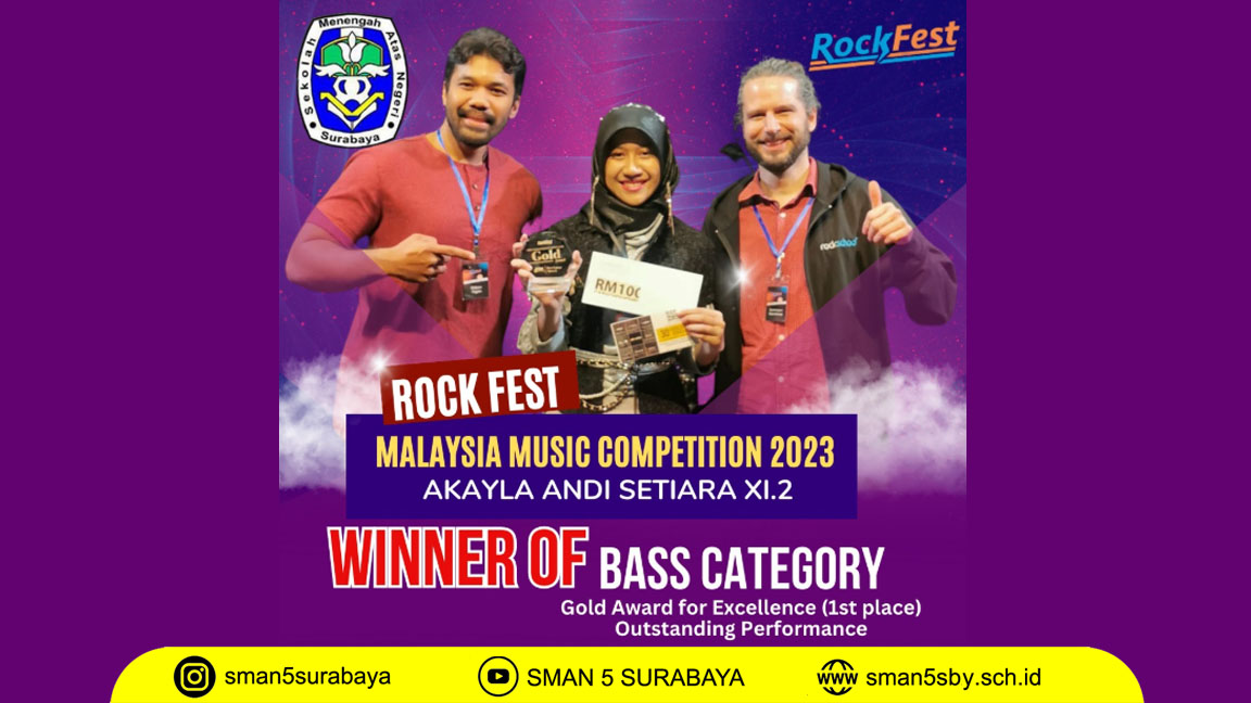 Prestasi gemilang kembali ditorehkan oleh siswa SMA Negeri 5 Surabaya di kancah internasional. Akayla Andi Setiara, siswa kelas XI.2, berhasil mengharumkan nama bangsa dengan meraih dua penghargaan sekaligus dalam ajang Rockfest Malaysia Music Competition 2023 yang diselenggarakan oleh Rockfest Malaysia.