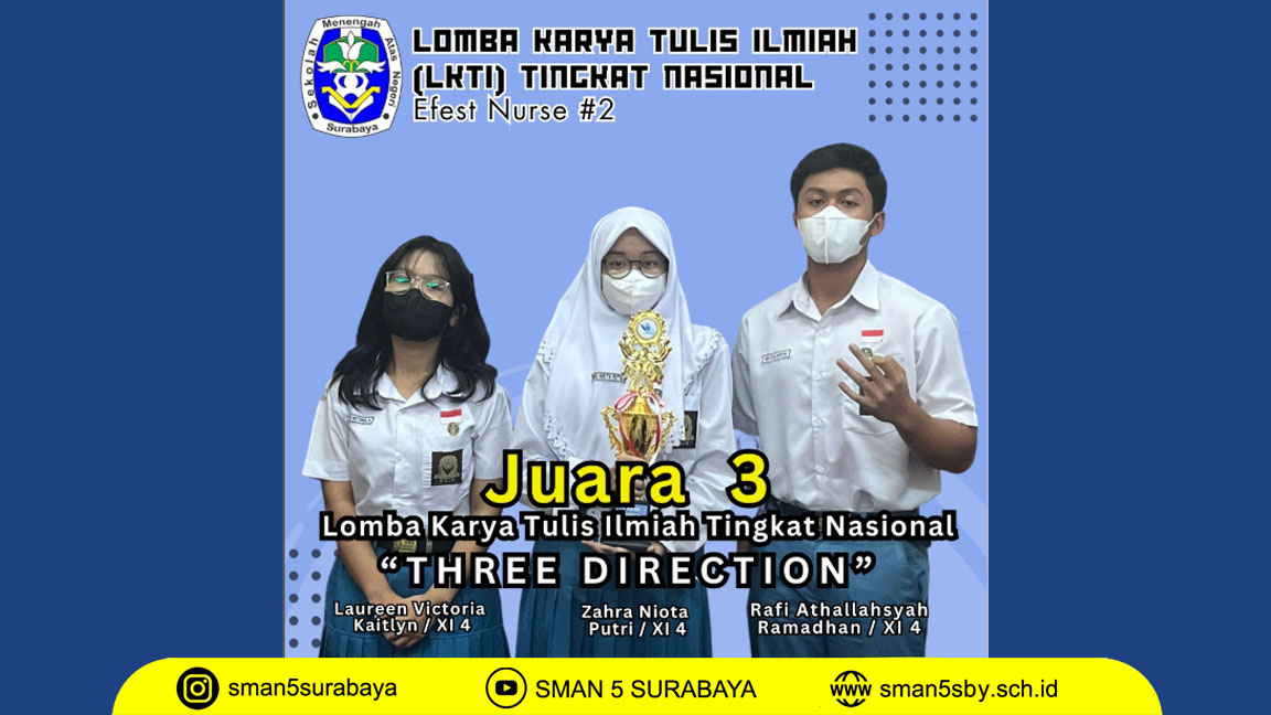 Tiga siswa hebat dari SMA Negeri 5 Surabaya, Rafi, Laureen, dan Zahra, yang merupakan trio dari kelas XI 4, sukses membawa pulang piala bergengsi. Dalam kompetisi Efest Nurse #2, mereka berhasil mengamankan posisi Juara 3 kategori Lomba Karya Tulis Ilmiah.