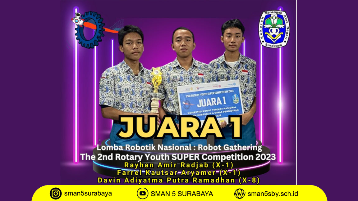Tim Robotika SMA Negeri 5 Surabaya kembali menorehkan prestasi membanggakan di kancah perlombaan tingkat nasional. Bertanding dalam ajang Rotary Youth Super Competition (RYSC) 2023 yang diselenggarakan di Universitas Airlangga, Surabaya pada tanggal 23-24 September 2023, para siswa berhasil mendominasi kategori kompetisi robot.