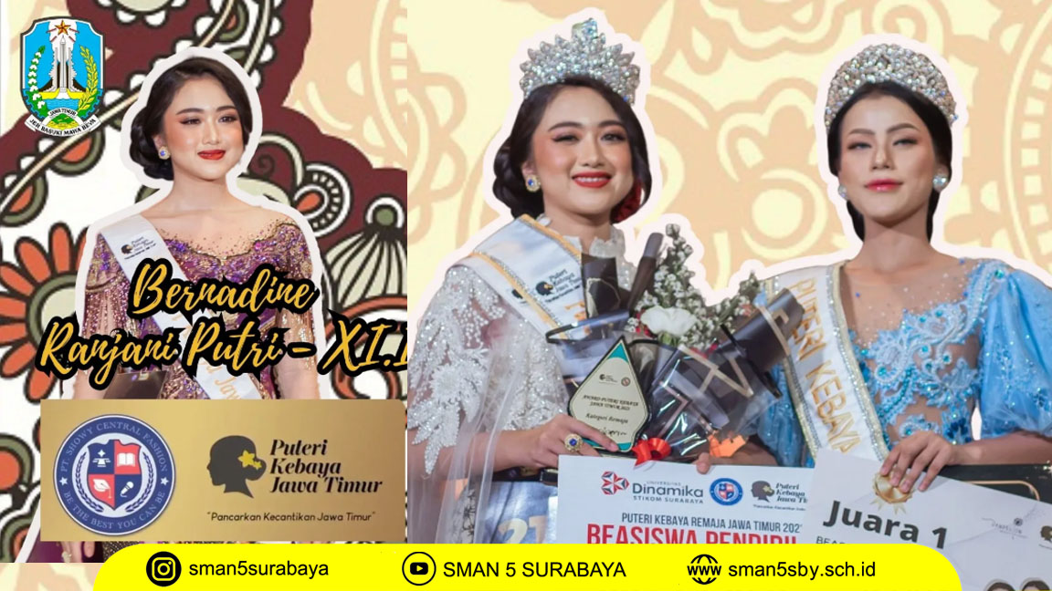 Kebanggaan kembali menghampiri keluarga besar Smala (SMA Negeri 5 Surabaya). Bernadine Ranjani Putri, siswi kelas XI.1, berhasil meraih gelar Juara 1 dalam ajang Puteri Kebaya Jawa Timur 2023.