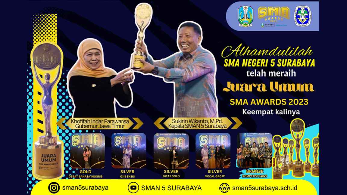 Setelah mendapatkan berbagai gelar dalam ajang SMA Award 2023 yang menggelar ajang kompetisi akademik dan non akademik. Bidang yang dijuarai diantaranya Juara I Debat Bahasa Inggris, Juara II OSIS Eksis, Juara II Gitar Solo, Juara II Vocal Group, dan Juara III Kompetisi Sains, alhamdulillah SMA Negeri 5 Surabaya akhirnya menjadi juara umum di ajang bergengsi di Jawa Timur tersebut. Terima kasih atas perjuangan para siswa dan para pembina yang telah mengantarkan almamater tercinta menjadi yang terbaik di Jawa Timur di tahun 2023 ini. Semoga gelar ini bisa dipertahankan di tahun depan
