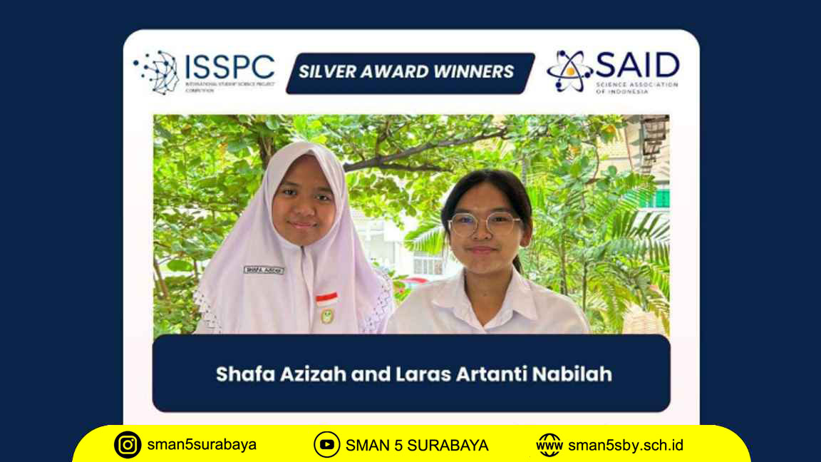 Dua srikandi SMA Negeri 5 Surabaya yaitu; Shafa Azizah (Xl – 1), dan Laras Artanti Nabilah (Xl – 4) berhasil menorehkan prestasi di tingkat Internasional yaitu ajang ISSPC 2024 (International Student Science Project Competition) yang diselenggarakan secara daring pada tanggal 14 – 18 Januari 2024, mereka memperoleh Silver Award. Kibarkan merah putih putih melalui prestasi kalian !!