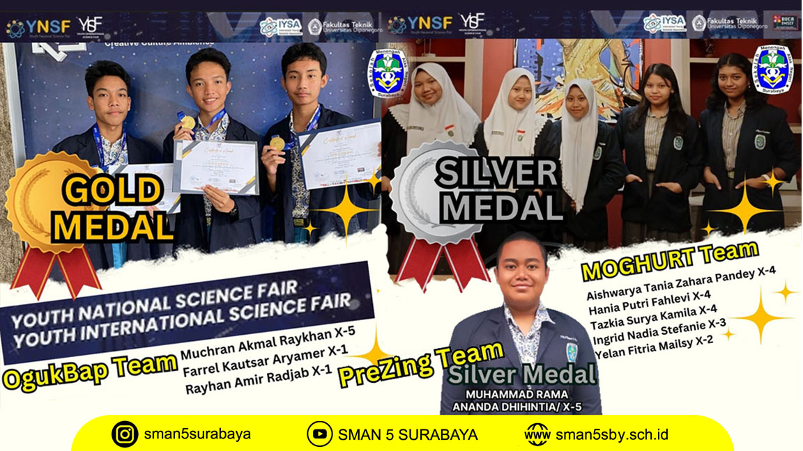 SMA Negeri 5 Surabaya kembali menorehkan prestasi membanggakan di kancah kompetisi sains internasional. Pada ajang Youth National Science Fair – Youth International Science Fair yang baru saja berlangsung, para siswa dan siswi kita berhasil meraih hasil gemilang dengan membawa pulang 1 Medali Emas dan 2 Medali Perak dari Fakultas Teknik Universitas Diponegoro.