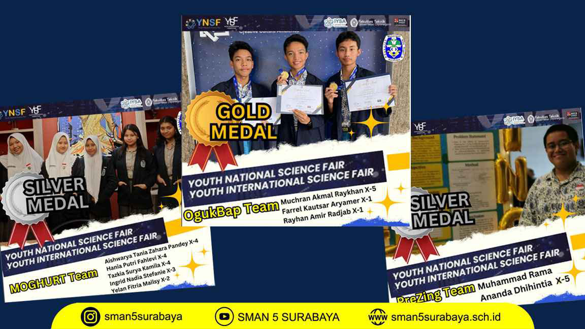 Kembali putra-putri terbaik SMA Negeri 5 Surabaya mempersembahkan medali bidang sains tingkan Internasional dalam ajang YISF (Youth International Science Fair), yang diselenggarakan oleh IYSA (Indonesian Young Scientist Association) secara daring (online) pada tanggal 28 Februari 2024. Tim yang berhasil meraih Gold Medals adalah Tim OgukBap yang beranggotakan; Farrel Kautsar Aryamer (X-1), Rayhan Amir Radjab (X-1), Muchran Akmal Raykhan (X-5) yang dilaksanakan secara Offline, di Malang Creative Center pada tanggal 29 Februari 2024