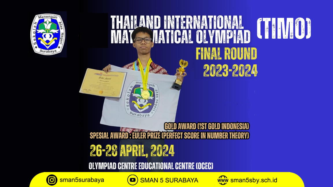 Surabaya, 28 April 2024 – Prestasi gemilang kembali ditorehkan oleh siswa SMA Negeri 5 Surabaya. Rayyan Aqsha Raditya, siswa kelas XI-6, berhasil mengharumkan nama bangsa dan sekolah dalam ajang Thailand International Mathematical Olympiad (TIMO) Final Round 2023-2024 yang diselenggarakan di Thailand.