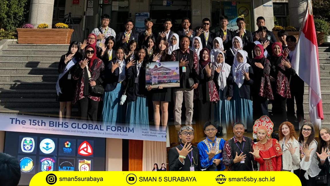Setelah beberapa tahun terhenti akibat pandemi program kerjasama dengan sekolah luar negeri kini bisa terlaksana kembali. Sejumlah 20 siswa-siswi SMA Negeri 5 Surabaya melawat ke Busan International High School (BIHS) Korea Selatan mulai tanggal 21 s.d. 31 Oktober 2024. Mereka mengikuti kegiatan “The 15th BIHS Global Forum” dengan agenda mempromosikan potensi sekolah dari masing-masing negara. Selain Indonesia yang diwakili SMA Negeri 5 Surabaya juga diikuti bersama 7 Negara lainnya yakni ; Cina, Rusia, Amerika Serikat, Jepang, Vietnam , dan tuan rumah Korea Selatan. Selain presentasi para siswa menampilkan “Traditional Performance” yang mendapatkan sambutan yang meriah dari peserta lain.