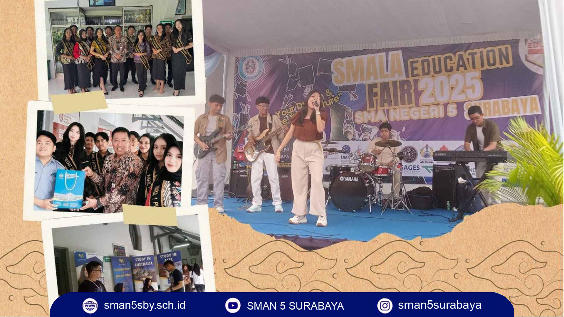 Hari ini Kamis, 23 Januari 2025 di SMA Negeri 5 Surabaya menyelenggarakana Pameran Pendidikan dengan tajuk “Smala Education Fair 2025”. Acara ini bertujuan memberikan gambaran secara langsung tentang dunia pendidikan di luar sekolah terutama di Perguruan Tinggi. Para peserta pameran itu dari lembaga Perguruan Tinggi Sahabat BK Smala yaitu Perguruan Tinggi Negeri dan Swasta Nasional. Khususnya di Jawa Timur dan beberapa perguruan tinggi di luar Jawa Timur. Para perwakilan kampus tersebut diberi kesempatan membuka Stand Pendidikan. Juga diberikan kesempatan untuk mempresentasikan program studi dari lembaganya masing-masing di SMA Negeri 5 Surabaya. Sasaran pameran pendidikan tersebut adalah para siswa-siswi SMA Negeri 5 Surabaya. Termasuk juga siswa-siswi sekolah di Surabaya juga diberi kesempatan untuk menghadiri pameran tersebut. Siswa-siswi sangat antusias dengan acara tersebut, mereka cukup kritis dan detail menanyakan tentang berbagai hal di perguruan tinggi. Selain informasi pendidikan dari berbagai perguruan tinggi dan lembaga pendidikan, acara tersebut diisi oleh penampilan-penampilan kreativitas dari siswa-siswi SMA Negeri 5 Surabaya di atas panggung sehingga acarapun menjadi tambah meriah. Sukses Smala Education Fair 2025.