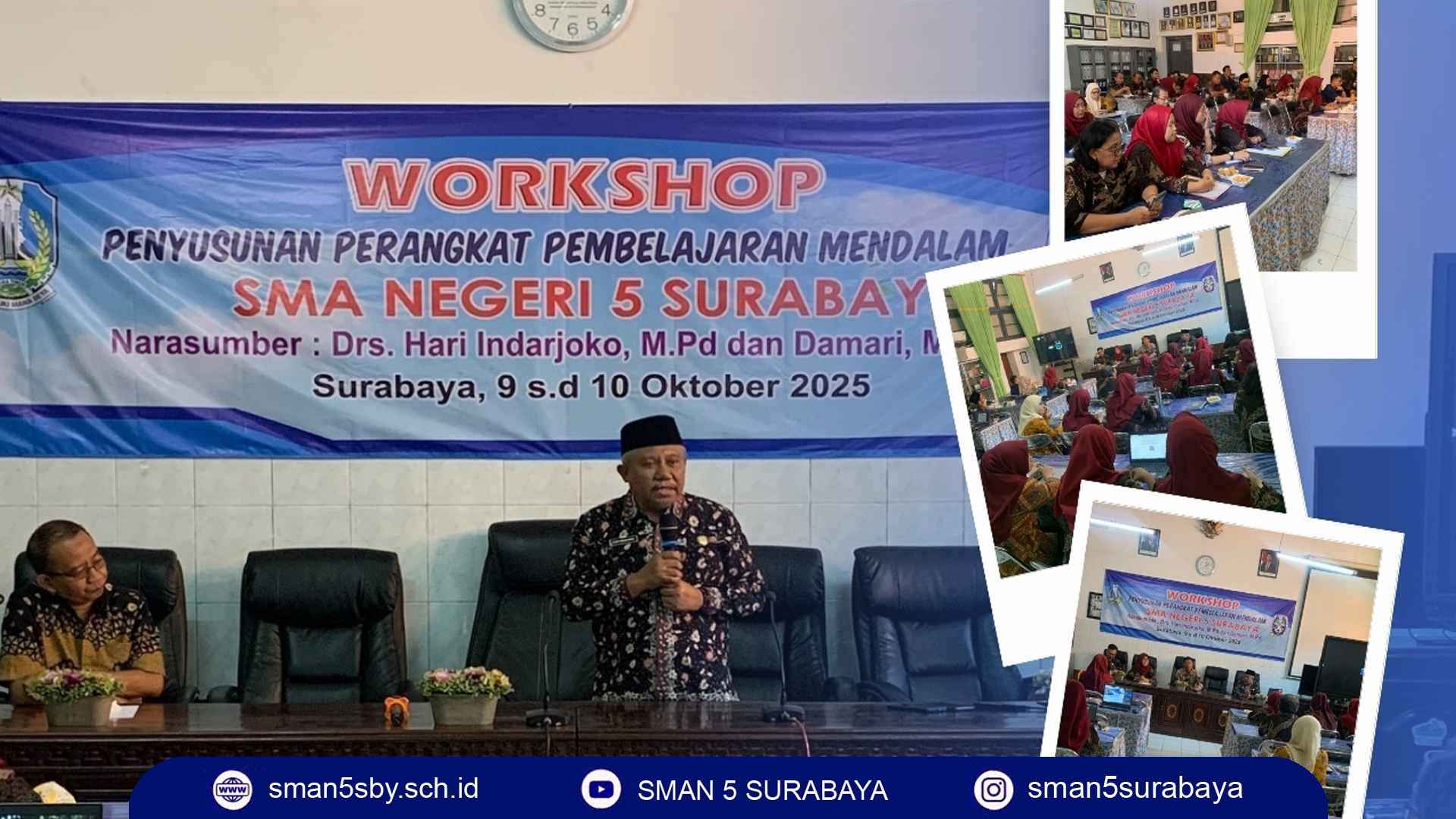 Bagi guru-guru SMA Negeri 5 Surabaya belajar adalah tidak hanya untuk murid saja, tetapi guru-guru juga wajib terus belajar. Setelah beberapa waktu lalu workshop yang lain yaitu tentang pemanfaatan kecerdasan buatan (AI) dalam pembelajaran. Kini workshop tentang penyusunan Perangkat Pembelajaran Mendalam. Materi tersebut disampaikan oleh Pengawas Sekolah Bapak Drs Hari Indarjoko, M.Pd dari Cabang Dinas Pendidikan Wilayah Sidoarjo (Kota Surabaya-Kab. Sidoarjo) yang dilaksanakan pada tanggal 9-10 Oktober 2025 di ruang serbaguna SMA Negeri 5 Surabaya.