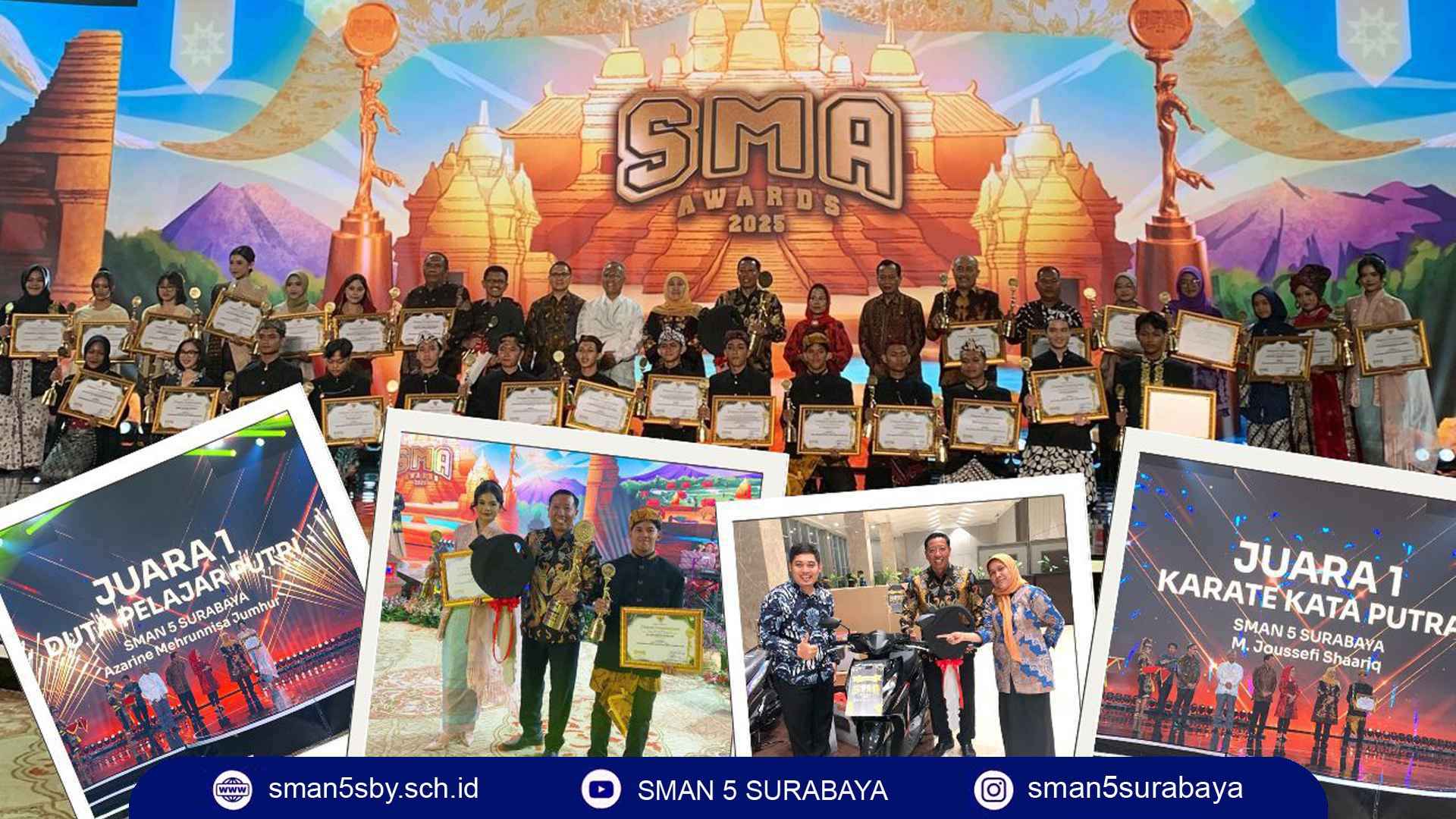 SMA Negeri 5 Surabaya kembali menorehkan prestasi gemilang di atahun ini. Kali ini dinobatkan sebagai Juara Umum SMA Award 2025 yang diselenggarakan oleh Pemerintah Provinsi Jawa Timur. Keberhasilan ini diraih berkat konsistensi dan keunggulan siswa-siswi “Smalane” yang meraih juara di berbagai kategori lomba . Prestasi tersebut antara lain Juara 1 Duta Pelajar Putri atas nama Azarine Mehrunnisa Jumhur, Juara 1 Karate Putra oleh M. Joussefi Shaariq, serta Juara Harapan 1 Debat Bahasa Inggris melalui Najwa Ataya Riandory . Dengan raihan ini, SMA Negeri 5 Surabaya berhasil membawa pulang piala bergilir Gubernur Jawa Timur dan satu unit sepeda motor . Gelar juara umum ini semakin mengukuhkan posisi SMA Negeri 5 Surabaya sebagai salah satu sekolah terbaik di Jawa Timur. Sekolah yang tidak hanya unggul dalam akademik, tetapi juga dalam pengembangan bakat dan karakter siswa.