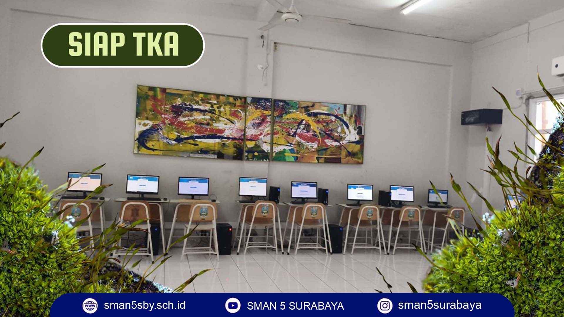 SMA Negeri 5 Surabaya dan juga siswa-siswinya siap untuk mengikuti Tes Kompetensi Akademik (TKA). Persiapan sudah diupayakan sangat maksimal, apalagi dalam seminggu terakhir ini tiap hari persiapannya luar biasa. Mulai dari latihan soal-soal beserta pembahasanya oleh guru pembimbing hingga jalur langit langit sudah dilakukan. Kemarin hari jumat seluruh siswa-siswi kelas XII melakukan doa bersama sesuai agama masing-masing dan juga memohon doa restu kepada Bapak Ibu guru dan juga kepada adik-adik kelasnya. Siswa-siswi kelas XII yang berjumlah 336 semua mengikuti Tes Kompetensi Akademik di tahun 2025 ini. Untuk melayani peserta TKA tersebut SMA Negeri 5 Surabaya menyiapkan 5 Laboratorium Komputer masing-masing Laboratorium terdiri dari 20 komputer client dan 2 komputer cadangan sehingga total 200 unit komputer client dan 5 unit komputer server. Adapun pelaksanaannya 2 (dua) gelombang dan 2 (dua) sesi. Gelombang pertama tanggal 3-4 November 2025 dan gelombang kedua tanggal 5-6 November 2025. Dengan persiapan yang sudah sedemikian rupa mudah-mudahan pelaksanaan TKA tahun berjalan lancar dengan hasil yang maksimal. Amin.