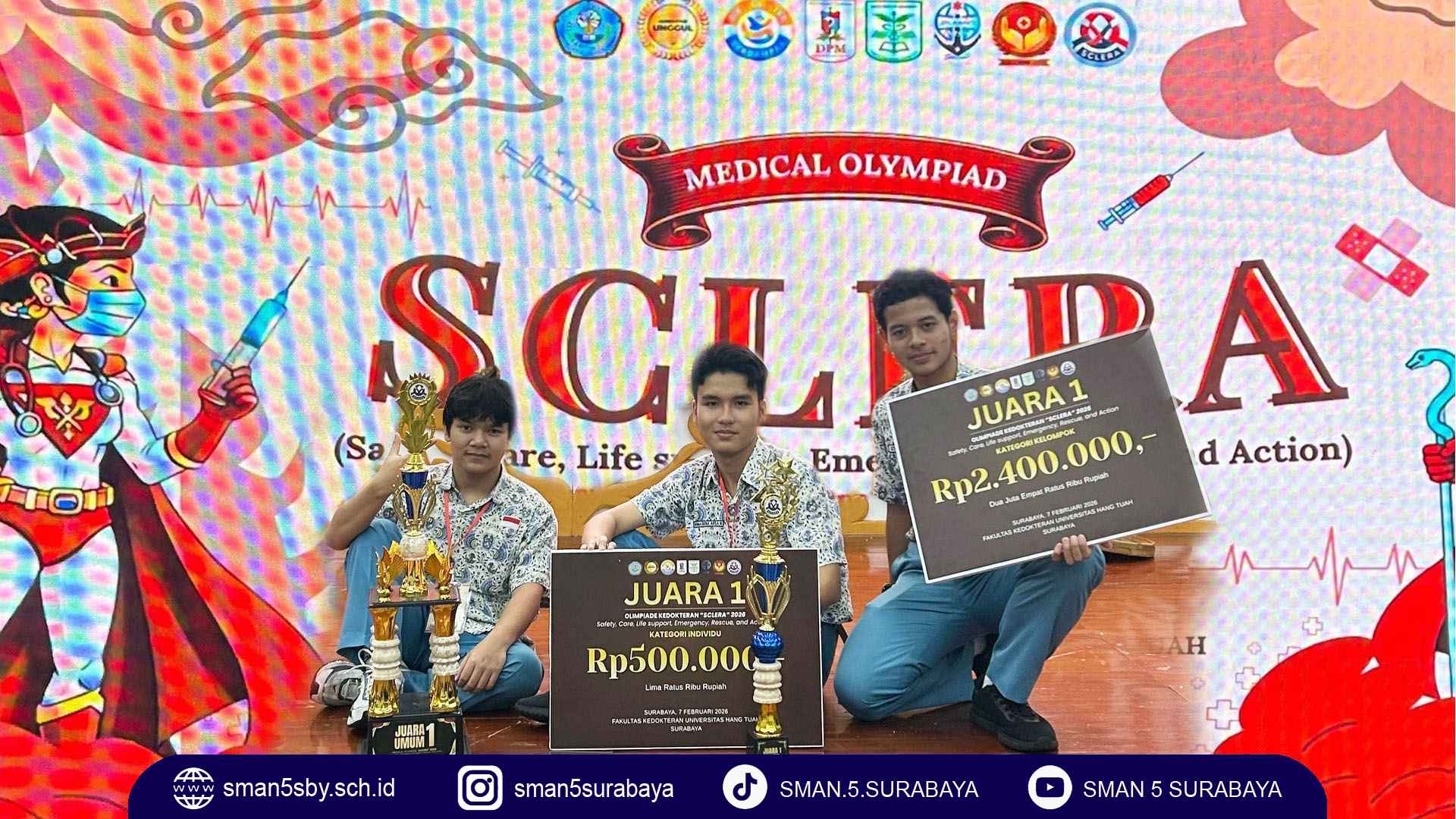 Surabaya, 7 Februari 2026 – Setelah melalui serangkaian kompetisi yang ketat, akhirnya membuahkan hasil. Para juara Medical Olympiad bertajuk SCLERA (Safety, Care, Life Support, Emergency, Rescue and Action). Penyelenggaranya Fakultas Kedokteran Universitas Hang Tuah (UHT) Surabaya. Ajang yang diikuti pelajar SMA/SMK se-Jawa Timur. Tidak hanya diuji pemahaman teori melalui Computer Based Test (CBT), tetapi juga keterampilan. Yaitu simulasi penanganan kegawatdaruratan, ketepatan tindakan, dan kerja sama tim .